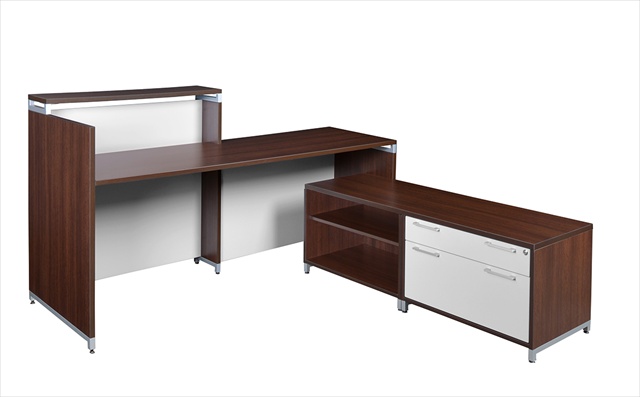 This ADA compliant reception desk shell offers a 42 in. high transaction counter as well as a low transaction counter for handicap access. The construction includes thermal fused melamine laminate with a commercial grade 3 mm. edge band and a metal support system for durability and style. The modesty on the high transaction top side leaves a perfect gap between the work surface and the modesty allowing for easy wire access. The 60 in. low storage credenza/lateral is constructed of thermal fused melamine laminate with a commercial grade 3 mm. edge band. Features leveling glides 6 in. polished metal handles locking drawers & 2 adjustable shelves. Personalize your space and offer everyone access to your reception area no matter what the need with this great desk. Features
