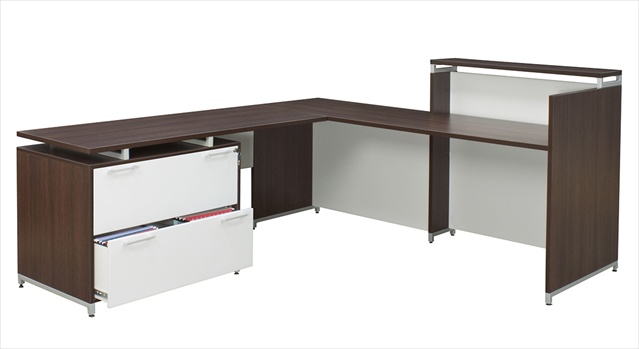 The ADA compliant reception desk shell offers a 42 in. high transaction counter as well as a low transaction counter for handicap access. construction includes thermal fused melamine laminate with a commercial grade 3 mm. edge band. OneDesk also features a metal support system for durability and style. The modesty on the high transaction top side leaves a perfect gap between the work surface and the modesty allowing for easy wire access. The full 36 in. lateral includes full suspension locking drawers that come equipped with 6 in. polished metal bar pulls & white drawer interiors. Includes leveling glides. Features