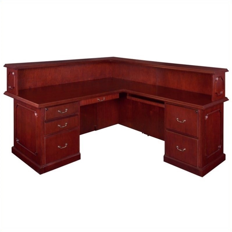 | Regency - Reception Desks - TVRD7236RMH - The Prestige Veneer Reception Desk adds delightful presence that echoes vitality and knowledge. It also features a wealth of drawers and space for chairs so that you're sure to be comfortable.Finish: mahogany6 drawers2 pedsLockable drawersRight returnBrass colored handlesOrnate edge detailsSpecifications:Overall Dimensions: 42 H x 72 W x 84 D