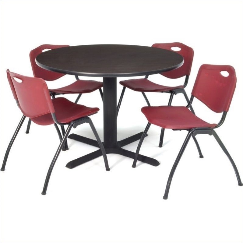 | Regency - Lunchroom Tables - TB36RNDMW47BY - Featuring a durably crafted table with sturdy, polypropylene, stackable chairs, this Mocha Walnut 36 Round Lunchroom Table & 4 Burgundy M Stack Chairs is perfect for your home or your business. Protecting the table's top is a thermal fused melamine laminate. Supporting the chairs are sturdy steel legs. Supporting the table are a tubular steel post with solid steel legs. Cain X BaseBlack tubular steel legs with textured powder coated finishHidden adjustable glidesTabletop constructed of thermal fused melamine laminate with Black PVC edgeSpecifications:Overall Product Dimensions: 29 H x 36 W x 36 D