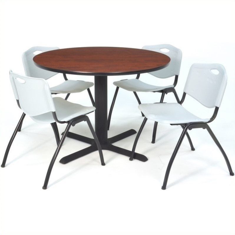 | Regency Round Lunchroom Table and 4 Grey M Stack Chairs in Cherry |