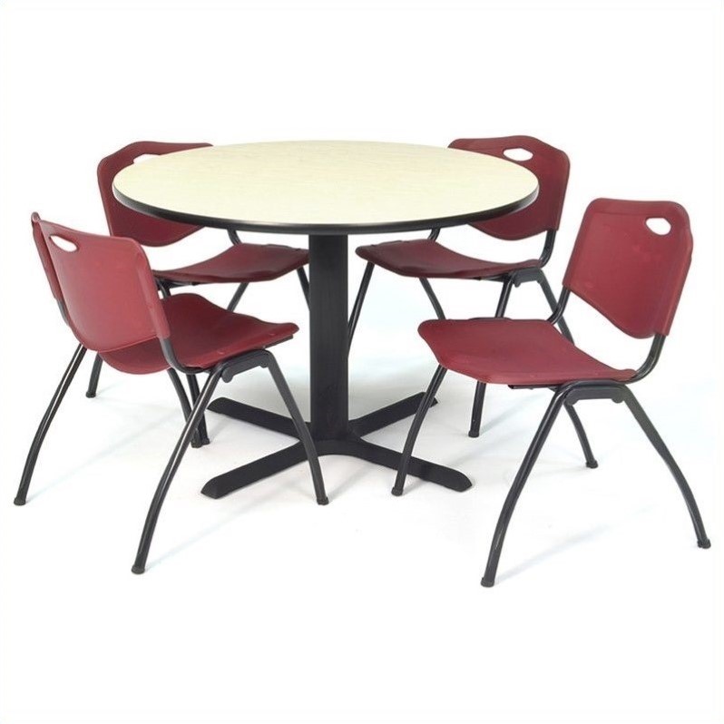 | Regency - Lunchroom Tables - TB30RNDPL47BY - Complement your modern office decor with this sleek table and chairs set. The table top is expertly crafted from thermal fused melamine that resists stains, burns and bumps. The tubular steel post and sturdy steel legs base provides a stable support. The hidden adjustable glides prevent any kind of floor damage. With contoured back and permeated seat, the chairs offer a comfortable seating experience and their stackable design allows easy storage.Round table with 4 M stack chairs in maple and burgundyMade of thermal fused melamine laminate, pvc and steelIncludes 1 round table and 4 M stack chairCain X baseTable features hidden adjustable glidesChair features sturdy frame and glides to eliminate floor damageIntegrated handle in backrestEasily stack up to 12 chairsSpecifications:30 inch Table Dimension: 29 H x 30 W x 30 D42 inch Table Dimension: 29 H x 42 W x 42 D
