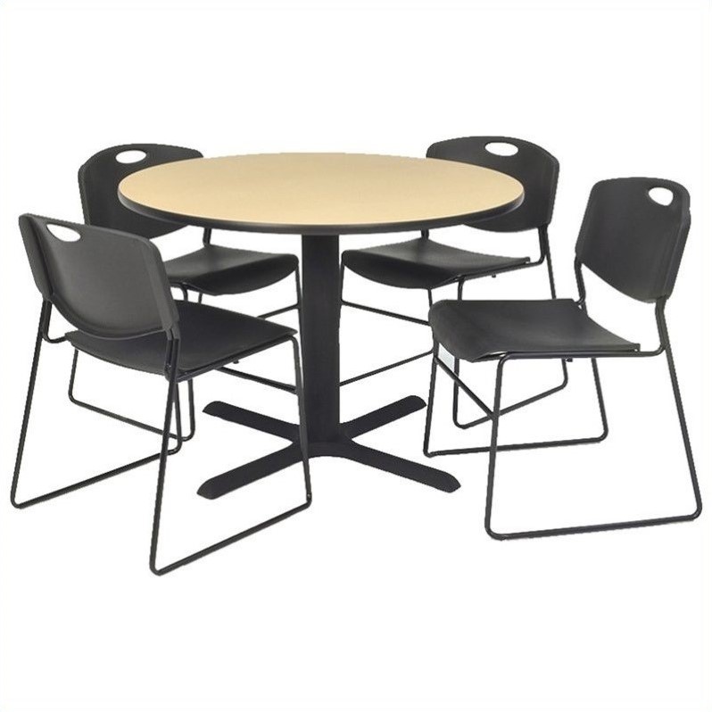 | Regency - Lunchroom Tables - TKB42RNDBE44BK - This table and chairs set offers style and versatility to your cafeteria, small conference room or break room. The sturdy round table top is made of thermal fused melamine with black PVC edge for durability. A tough, Kobe X-base crafted from tubular steel provides a stable support. The chairs feature a contoured back and permeated seat for total seating comfort. Their metal frame ensures durability, while the stackable design provides easy storage. Each piece in this set has glides on the feet to prevent floor damage.Round table with 4 Zeng stacker chairs in beige and blackMade of thermal fused melamine laminate, pvc and steelIncludes 1 round table and 4 Zeng stack chairKobe X baseTable features adjustable glides and end capsAntimicrobial seat and backChair features sturdy frameEasily stack up to 12 chairsSpecifications:30 inch Table Dimension: 29 H x 30 W x 30 D36 inch Table Dimension: 29 H x 36 W x 36 D42 inch Table Dimension: 29 H x 42 W x 42 D