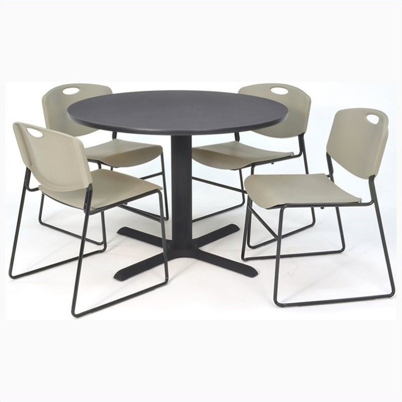 | Regency - Lunchroom Tables - TKB42RNDGY44GY - Contemporary and elegant, the Training and Hospitality table set looks captivating in any modern food court. It consists of a round thermal fused melamine laminate top. The sturdy top is supported by a sturdy tubular kobe X base at the center. The 4 compact chairs with a trendy black seat and backrest complete the set. The table and chairs feature a durable build quality which is sure to last for years.Round table with 4 Zeng stacker chairs in greyMade of thermal fused melamine laminate, pvc and steelIncludes 1 round table and 4 Zeng stack chairKobe X baseTable features adjustable glides and end capsAntimicrobial seat and backChair features sturdy frameEasily stack up to 12 chairsSpecifications:30 inch Table Dimension: 29 H x 30 W x 30 D36 inch Table Dimension: 29 H x 36 W x 36 D42 inch Table Dimension: 29 H x 42 W x 42 D