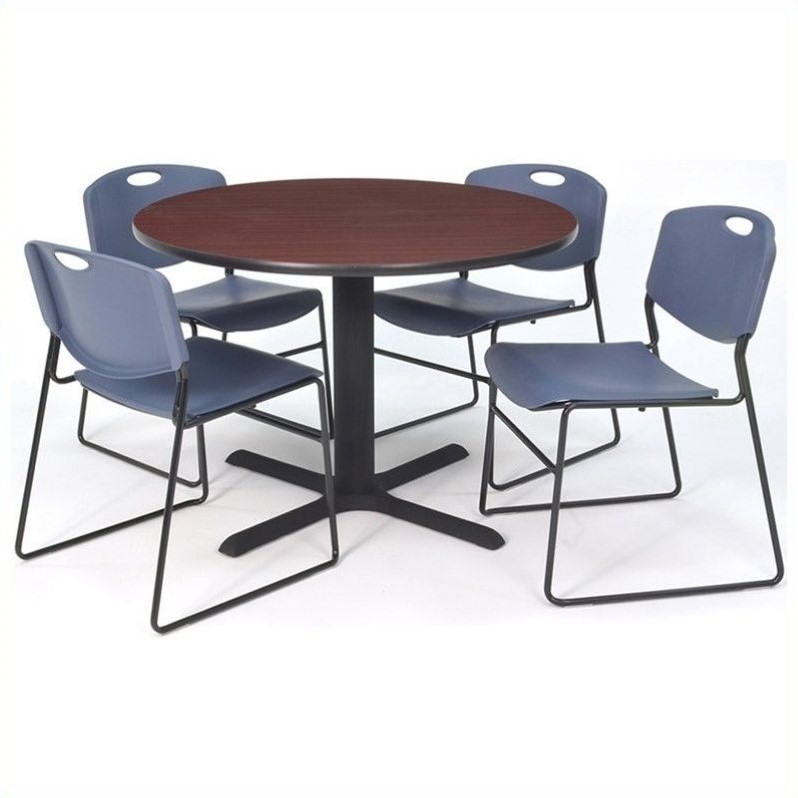 | Regency - Lunchroom Tables - TKB42RNDMH44BE - Contemporary and elegant, the Training and Hospitality table set looks captivating in any modern food court. It consists of a round thermal fused melamine laminate top. The sturdy top is supported by a sturdy tubular kobe X base at the center. The 4 compact chairs with a trendy black seat and backrest complete the set. The table and chairs feature a durable build quality which is sure to last for years.Round table with 4 Zeng stacker chairs in mahogany and blueMade of thermal fused melamine laminate, pvc and steelIncludes 1 round table and 4 Zeng stack chairKobe X baseTable features adjustable glides and end capsAntimicrobial seat and backChair features sturdy frameEasily stack up to 12 chairsSpecifications:30 inch Table Dimension: 29 H x 30 W x 30 D36 inch Table Dimension: 29 H x 36 W x 36 D42 inch Table Dimension: 29 H x 42 W x 42 D