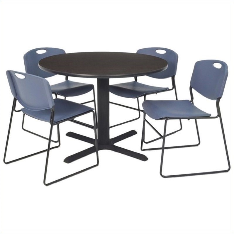 | Regency - Lunchroom Tables - TKB30RNDMW44BE - Charming and contemporary, the Training and Hospitality table set is sure to match the decor of any modern office. It consists of a round thermal fused melamine laminate top. The sturdy top is supported by a sturdy tubular kobe X base at the center. The 4 compact chairs with a trendy seat and backrest complete the set. The table and chairs feature a durable build quality which is sure to last for years.Round table with 4 Zeng stack chairs in mocha walnut and blueMade of thermal fused melamine laminate, pvc and steelIncludes 1 round table and 4 Zeng stack chairKobe X baseTable features adjustable glides and end capsAntimicrobial seat and backChair features sturdy frameEasily stack up to 12 chairsSpecifications:30 inch Table Dimension: 29 H x 30 W x 30 D36 inch Table Dimension: 29 H x 36 W x 36 D42 inch Table Dimension: 29 H x 42 W x 42 D