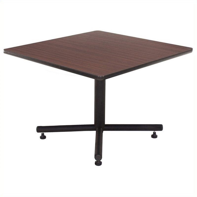 | Regency - Lunchroom Tables - TKB3636MH - Add minimalist modern style to your cafe or restaurant with this sleek table. It features a simple square top with Kobe base. The top is crafted from engineered wood wrapped in thermal fused melamine laminate, while the base is made of metal with a black powder coat finish. The table is also equipped with adjustable leveling glides which prevent floor damage and offer stability.Square lunchroom table with metal kobe X base in mahoganyMade of thermal fused melamine laminate, pvc and steelKobe X baseAdjustable leveling glidesSpecifications:30 inch Table Dimension: 30 H x 30 W x 30 D36 inch Table Dimension: 30 H x 36 W x 36 D42 inch Table Dimension: 30 H x 42 W x 42 D48 inch Table Dimension: 30 H x 48 W x 48 D
