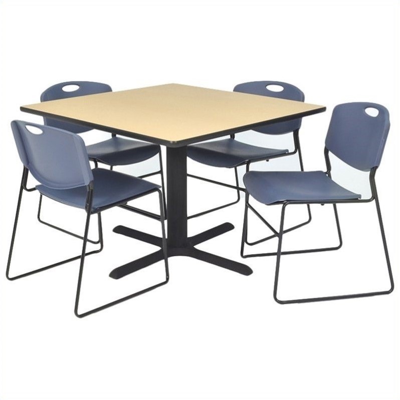 | Regency - Lunchroom Tables - TKB3636BE44BE - The Training and Hospitality table and chairs set is a must have for any modern office space. The table top is made of thermal fused melamine which prevents bumps, scratches and stains. The Kobe X-base is crafted from tubular steel for sturdy support. The comfortable chairs feature a contoured back and permeated seat. Their metal frame ensures durability, while the stackable design provides easy storage. The table and chairs have glides on the feet which prevent floor damage.Square table with 4 Zeng stacker chairs in beige and blueMade of thermal fused melamine laminate, pvc and steelIncludes 1 square table and 4 Zeng stack chairKobe X baseTable features adjustable glides and end capsAntimicrobial seat and backChair features sturdy frameEasily stack up to 12 chairsSpecifications:30 inch Table Dimension: 29 H x 30 W x 30 D36 inch Table Dimension: 29 H x 36 W x 36 D42 inch Table Dimension: 29 H x 42 W x 42 D