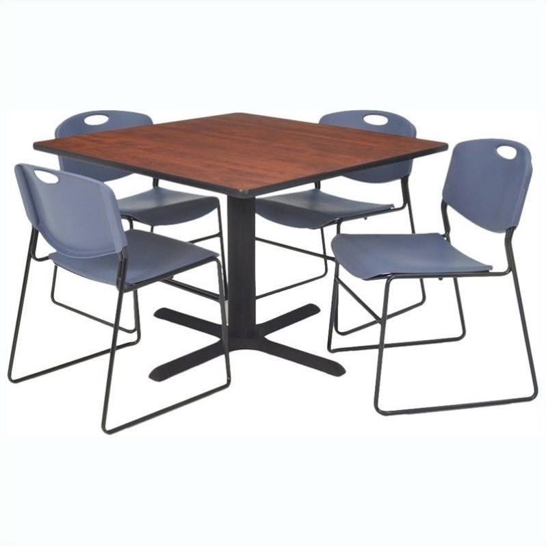 | Regency - Lunchroom Tables - TKB3030CH44BE - The Training and Hospitality table and chairs set will look impressive in your cafe, restaurant or lunch room. The table top is made of thermal fused melamine which prevents bumps, scratches and stains. The Kobe X-base is crafted from tubular steel for sturdy support. The comfortable chairs feature a contoured back and permeated seat. Their metal frame ensures durability, while the stackable design provides easy storage. The table and chairs have glides on the feet which prevent floor damage.Square table with 4 Zeng stacker chairs in cherry and blueMade of thermal fused melamine laminate, pvc and steelIncludes 1 square table and 4 Zeng stack chairKobe X baseTable features adjustable glides and end capsAntimicrobial seat and backChair features sturdy frameEasily stack up to 12 chairsSpecifications:30 inch Table Dimension: 29 H x 30 W x 30 D36 inch Table Dimension: 29 H x 36 W x 36 D42 inch Table Dimension: 29 H x 42 W x 42 D