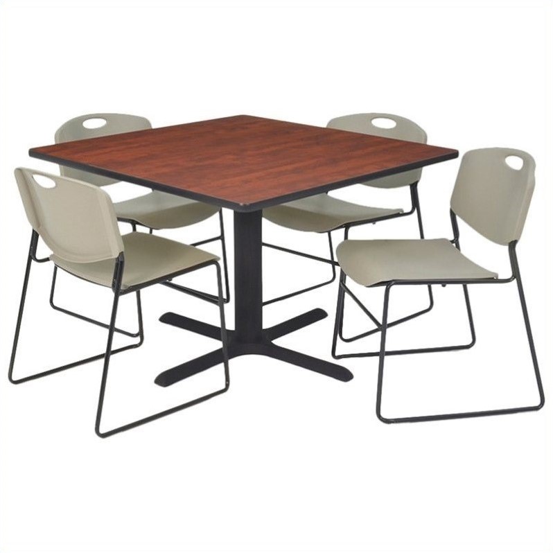 | Regency - Lunchroom Tables - TKB4242CH44GY - Sleek and stunning, the Training and Hospitality table is a great way to enhance your training room or break room decor. The table top is made of thermal fused melamine which prevents bumps, scratches and stains. The Kobe X-base is crafted from tubular steel for sturdy support. The comfortable chairs feature a contoured back and permeated seat. Their metal frame ensures durability, while the stackable design provides easy storage. The table and chairs have glides on the feet which prevent floor damage.Square table with 4 Zeng stacker chairs in cherry and greyMade of thermal fused melamine laminate, pvc and steelIncludes 1 square table and 4 Zeng stack chairKobe X baseTable features adjustable glides and end capsAntimicrobial seat and backChair features sturdy frameEasily stack up to 12 chairsSpecifications:30 inch Table Dimension: 29 H x 30 W x 30 D36 inch Table Dimension: 29 H x 36 W x 36 D42 inch Table Dimension: 29 H x 42 W x 42 D