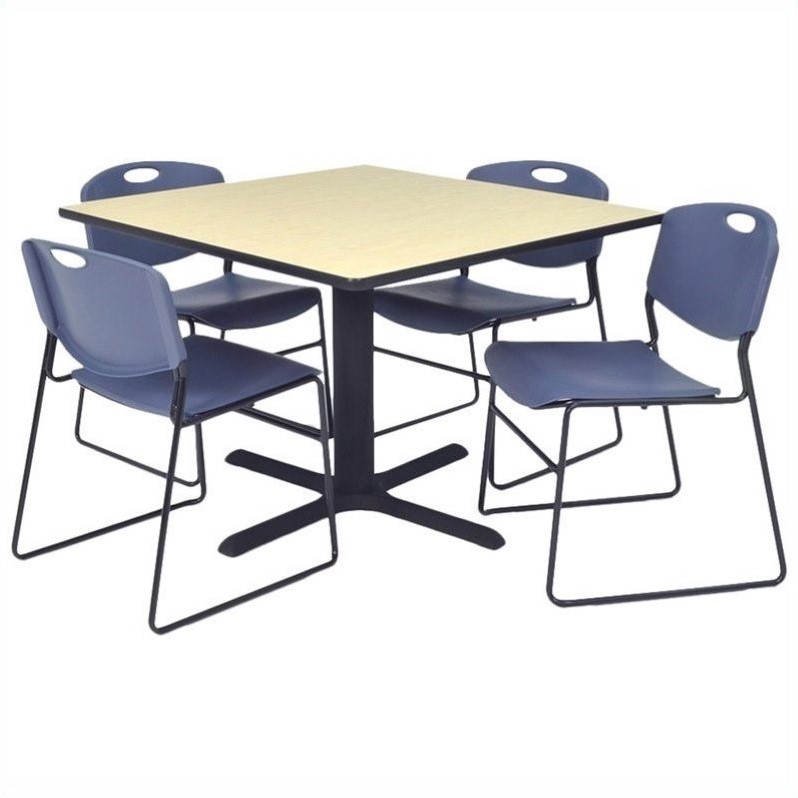 | Regency - Lunchroom Tables - TKB3636PL44BE - Add a stylish touch to your lunch room, restaurant or cafe with the Training and Hospitality table and chairs set. The table top is made of thermal fused melamine which prevents bumps, scratches and stains. The Kobe X-base is crafted from tubular steel for sturdy support. The comfortable chairs feature a contoured back and permeated seat. Their metal frame ensures durability, while the stackable design provides easy storage. The table and chairs have glides on the feet which prevent floor damage.Square table with 4 Zeng stacker chairs in maple and blueMade of thermal fused melamine laminate, pvc and steelIncludes 1 square table and 4 Zeng stack chairKobe X baseTable features adjustable glides and end capsAntimicrobial seat and backChair features sturdy frameEasily stack up to 12 chairsSpecifications:30 inch Table Dimension: 29 H x 30 W x 30 D36 inch Table Dimension: 29 H x 36 W x 36 D42 inch Table Dimension: 29 H x 42 W x 42 D