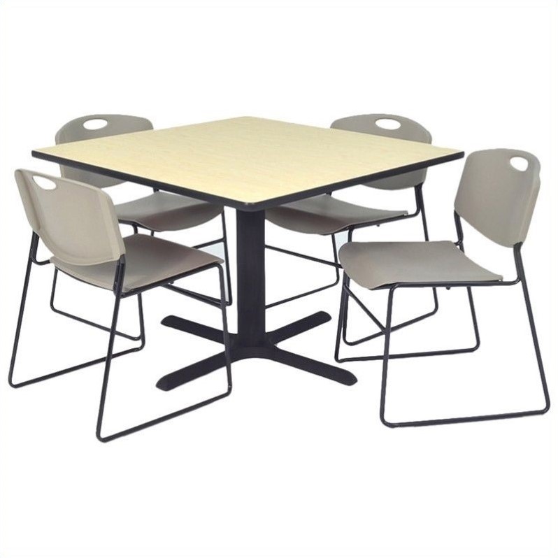 | Regency - Lunchroom Tables - TKB3636PL44GY - Featuring a minimalist contemporary style, this table and chairs set is perfect for you cafeteria or break room. The sturdy square table top is made of thermal fused melamine with black PVC edge for durability. A tough, Kobe X-base crafted from tubular steel provides a stable support. The chairs feature a contoured back and permeated seat for total seating comfort. Their metal frame ensures durability, while the stackable design provides easy storage. Each piece in this set has glides on the feet to prevent floor damage.Square table with 4 Zeng stacker chairs in maple and greyMade of thermal fused melamine laminate, pvc and steelIncludes 1 square table and 4 Zeng stack chairKobe X baseTable features adjustable glides and end capsAntimicrobial seat and backChair features sturdy frameEasily stack up to 12 chairsSpecifications:30 inch Table Dimension: 29 H x 30 W x 30 D36 inch Table Dimension: 29 H x 36 W x 36 D42 inch Table Dimension: 29 H x 42 W x 42 D
