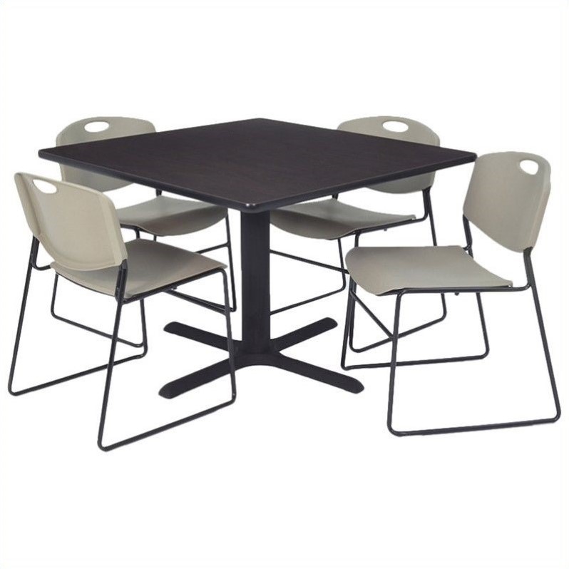 | Regency - Lunchroom Tables - TKB3030MW44GY - Stylish and contemporary, the Training and Hospitality table set is a perfect addition to your training room, lunch room or restaurant. The table top is made of thermal fused melamine which prevents bumps, scratches and stains. The Kobe X-base is crafted from tubular steel for sturdy support. The comfortable chairs feature a contoured back and permeated seat. Their metal frame ensures durability, while the stackable design provides easy storage. The table and chairs have glides on the feet which prevent floor damage.Square table with 4 Zeng stack chairs in mocha walnut and greyMade of thermal fused melamine laminate, pvc and steelIncludes 1 square table and 4 Zeng stack chairKobe X baseTable features adjustable glides and end capsAntimicrobial seat and backChair features sturdy frameEasily stack up to 12 chairsSpecifications:30 inch Table Dimension: 29 H x 30 W x 30 D36 inch Table Dimension: 29 H x 36 W x 36 D42 inch Table Dimension: 29 H x 42 W x 42 D