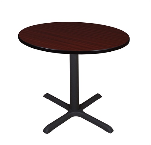The 36 in. Round Table Top is constructed of thermal fused melamine that protects against stains burns bumps and bruises. A black PVC edge adds extra protection. The Cain X-Base is constructed of a black tubular steel post and solid steel legs with a textured powder coat finish. The table feet feature hidden adjustable glides that make this table ideal for training rooms lunch rooms restaurants cafes or small conference rooms. Features