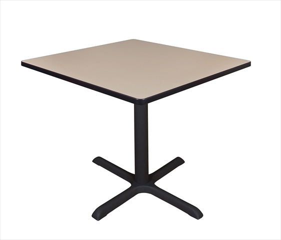 The 42 in. Square Table Top is constructed of thermal fused melamine that protects against stains burns bumps and bruises. A black PVC edge adds extra protection. The Cain X-Base is constructed of a black tubular steel post and solid steel legs with a textured powder coat finish. The table feet feature hidden adjustable glides that make this table ideal for training rooms lunch rooms restaurants cafes or small conference rooms. Features