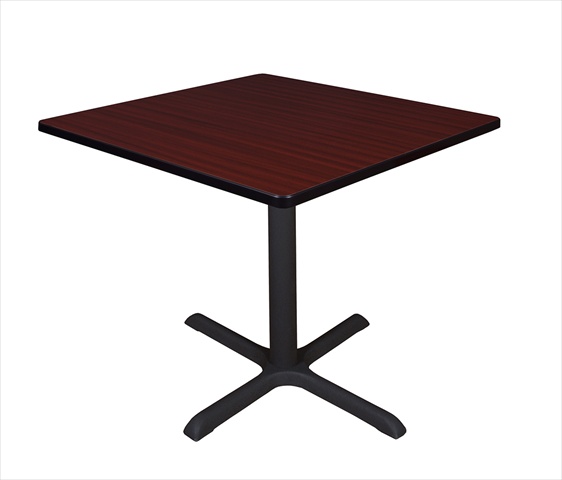 The 42 in. Square Table Top is constructed of thermal fused melamine that protects against stains burns bumps and bruises. A black PVC edge adds extra protection. The Cain X-Base is constructed of a black tubular steel post and solid steel legs with a textured powder coat finish. The table feet feature hidden adjustable glides that make this table ideal for training rooms lunch rooms restaurants cafes or small conference rooms. Features
