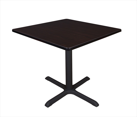 The 42 in. Square Table Top is constructed of thermal fused melamine that protects against stains burns bumps and bruises. A black PVC edge adds extra protection. The Cain X-Base is constructed of a black tubular steel post and solid steel legs with a textured powder coat finish. The table feet feature hidden adjustable glides that make this table ideal for training rooms lunch rooms restaurants cafes or small conference rooms. Features