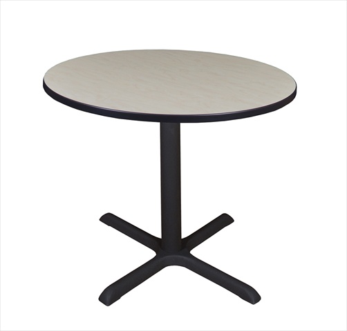 The 42 in. Round Table Top is constructed of thermal fused melamine that protects against stains burns bumps and bruises. A black PVC edge adds extra protection. The Cain X-Base is constructed of a black tubular steel post and solid steel legs with a textured powder coat finish. The table feet feature hidden adjustable glides that make this table ideal for training rooms lunch rooms restaurants cafes or small conference rooms. Features