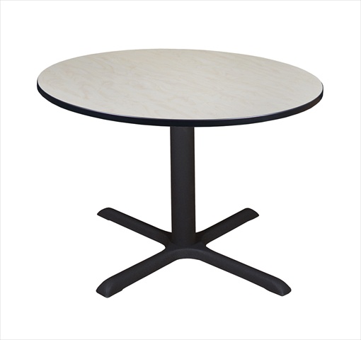 The 48 in. Round Table Top is constructed of thermal fused melamine that protects against stains burns bumps and bruises. A black PVC edge adds extra protection. The Cain X-Base is constructed of a black tubular steel post and solid steel legs with a textured powder coat finish. The table feet feature hidden adjustable glides that make this table ideal for training rooms lunch rooms restaurants cafes or small conference rooms. Features