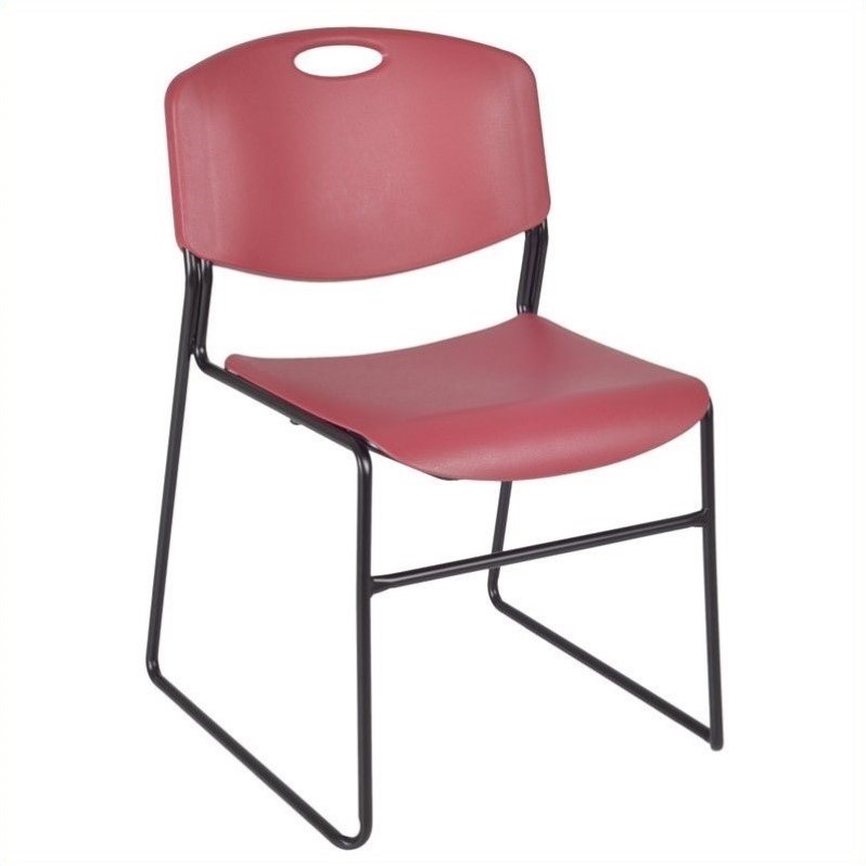 | Regency - Stacking Chairs - 4400BY4PK - This set of 4 stackable chairs in burgundy creates an ideal seating area in your reception areas, conferences rooms, break rooms and training rooms. The chairs feature an armless design with color permeated seat and back. A sturdy metal frame ensures durability and strength. The back of the chairs offers built in handle for better handling while moving from one room to another. With their stackable design, these chairs are easy to store when not in use.Stack chair in burgundyMade of polypropylene and metalColor permeated seat and backIntegrated handle in backrestSturdy frameEasily stack up to 12 chairsMaximum weight: 400 lbsSpecifications:Overall Dimensions: 34 H x 22 W x 25 D